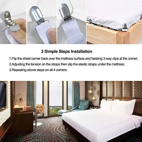 ❤Easy to use,Fasten 3 clips at corner of your sheets, Repeat above for all 4 corners and flip the fitted corner back down over the mattress, Adjusting the tension on the straps.They will grip your bed sheets firmly and keep your bed looks neat at all times.