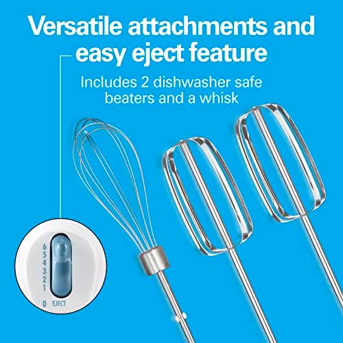 Versitile attachments and easy eject feature. The hand mixer comes with 2 traditional beaters and a whisk. Simply press the speed dial to release the dishwasher safe attachments for fast cleanup without getting your hands messy.