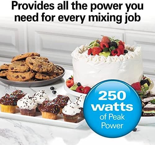 250 watts of peak power. This Hamilton Beach hand mixer provides all the power you need for every mixing job, whether you’re adding nuts and chocolate chips to cookie dough or making fluffy whipped cream.