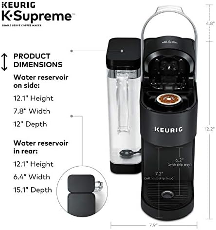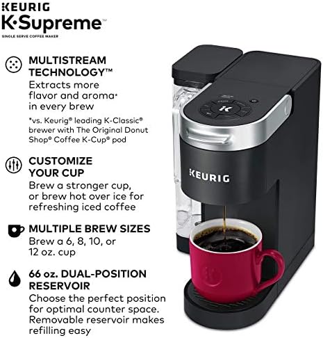 Elevate your everyday coffee experience to delicious new heights with the Keurig K-Supreme Single Serve coffee maker in Black. The K-Supreme coffee maker is the first series of Keurig brewer to feature MultiStream Technology, an innovative new way to more evenly saturate the coffee grounds* in every K-Cup pod. This technique extracts full flavor and aroma from your K-Cup pod, so you can enjoy an exceptionally flavorful experience every time you brew. Looking to customize your perfect cup? Use the Strong button for a stronger, more intense coffee taste or brew hot over ice for a refreshingly delicious iced coffee. No matter what you prefer, you can enjoy 6, 8, 10, or 12 oz. of your favorite coffee, tea, cocoa, and more – all freshly brewed in minutes. The K-Supreme coffee maker is travel mug-friendly, and the stylish 66 oz. dual-position reservoir makes it easy to refill and easy to find the perfect spot on your countertop. Choose from hundreds of delicious varieties of K-Cup pods or brew your own ground coffee with the My K-Cup Universal Reusable Coffee Filter (sold separately). *vs. Keurig leading K-Classic brewer
