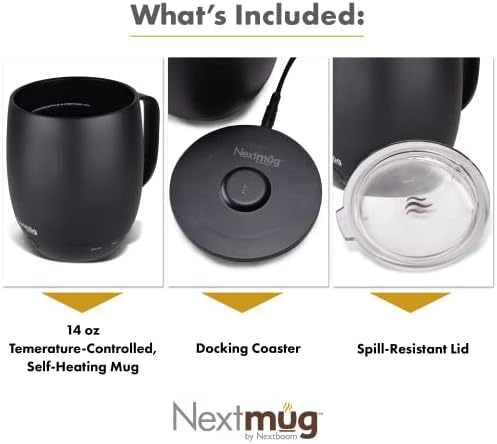 WHAT’S INCLUDED – (1) 14 oz Nextmug; (2) Docking Coaster & 6-foot cord to charge the lithium-ion battery inside the Nextmug; (3) Spill-Resistant Lid to keep hot liquids in the mug and help maintain the ideal temperature for longer periods of time.