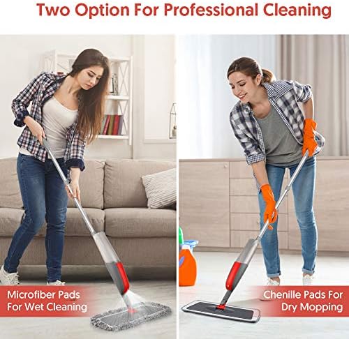 MEXERRIS – We Are Aim To Making Your Household Cleaning More Easier We are offering below reason to choose our spray mop – Free Your Hand: If you are still using traditional way like one hand hold cleaner spray, one hand hold mop to cleaning, our spray mop is very lightweight and easy to operate, all you need to do is squeeze the trigger on the top, it will spraying mist, you could start your cleaning now. – Free Your Back – Our spray mop come with 3 poles, it is long enough for you to do household cleaning, it is adjustable, even suitable for kids to cleaning. You don’t have to knee down or bend down, free your back from now! – Add Your Costumed Cleaner – You could filled up your favorite cleaning into the refillable bottle according your needs, like vinegar or essential oil. Your will have variety choice of cleaning solution! – 2th Generation of Spray Mop – MEXERRIS upgrade spray mop applying sturdier, more durable material, built with more ergonomic design, no need worry about quality problem! – More Professional For Dry And Wet Cleaning – We are offering two different kind of Mop pads to achieve wet and dry cleaning in one mop. Microfiber mop pads with finest nylon locking tech, thicker and features strong decontamination ability, no streak left, cleaning with ease. Chenille Mop pads are perfect for dry using, easily pick up hairs or dog hairs, it is features high ability of soaking and locking water, perfect for dry cleaning or scrubbing.