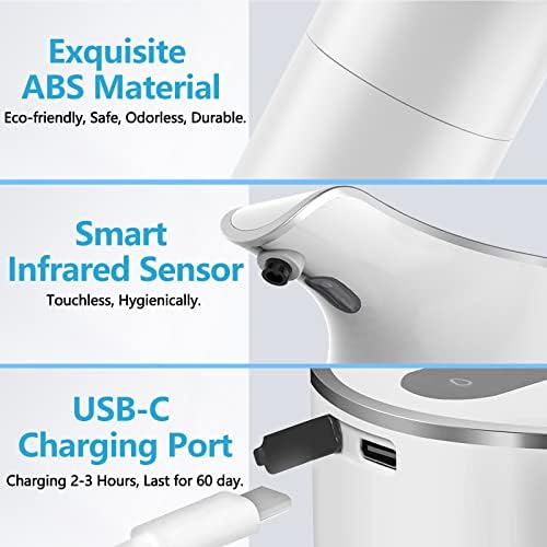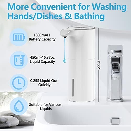 SMART SWITCH, BUTTONS, AND ADJUSTMENTS – The touchpad and indicator light at the top of the dispenser make it easy to turn on or off, while the 0.25-second automatic soap dispensing feature makes it efficient and effortless. You can adjust the volume of soap by pressing the small or large water drop buttons to your desired consistency, with 1 to 5 adjustment settings.